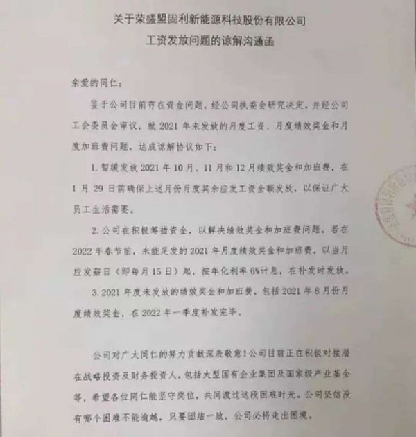 作为曾经知名的动力电池公司,荣盛盟固利新能源股份有限公司(下称荣盛盟固利)近日向员工发送了一份“谅解沟通函”。沟通函称,暂缓发放2021年10月、11月和12月的绩效奖金和加班费,理由是公司目前存在资金问题。
