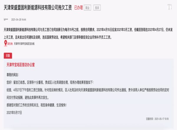 对此,天津市宝坻区信访办公室回复称,区人社局及时向天津荣盛盟固利新能源科技有限公司作出通报,责令该用人单位严格按照劳动合同约定时间支付劳动报酬,避免此类事件再次发生。