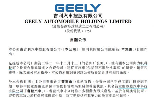 近日,吉利汽车在港交所发布公告称,其与力帆集团共同组建的合资公司——重庆睿蓝汽车科技有限公司(下称“睿蓝汽车”)已完成工商注册登记手续,并正式落户于重庆市两江新区。