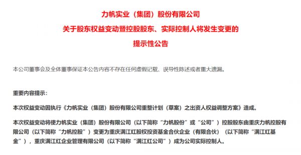 力帆发布重整完成公告,截图自公告