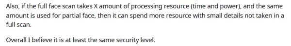 有关芯片的猜测,Reddit的果粉板块上,有人说得很有道理:「如果全脸扫描识别需要使用一定量的时间、算力等处理资源,然后处理部分脸部扫描识别的还是同等量资源的话,那么算法必定要在识别全脸扫描时忽略的小细节上投入更多算力。」