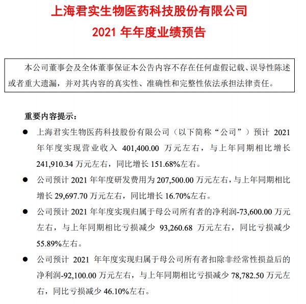 1月28日晚间,君实生物发布2021年年度业绩预告,公司全年营收40.14亿元左右,同比增长151.68%左右。归属于母公司所有者净利润为-7.36亿元左右,与上年同期相比亏损减少9.33亿元左右,同比亏损减少55.89%左右。扣非净利润为9.21亿元左右,同比亏损减少46.10%左右。