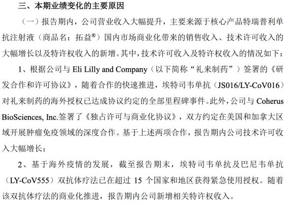 君实生物在年报预告中提及,公司的新冠中和抗体埃特司韦单抗(JS016/LY-CoV016)对礼来制药的海外授权已达成协议约定的全部里程碑事件。埃特司韦单抗及巴尼韦单抗(LY-CoV555)双抗体疗法已在超过15个国家和地区获得紧急使用授权。随着该双抗体疗法的商业化推进,报告期内公司新增相关特许权收入。