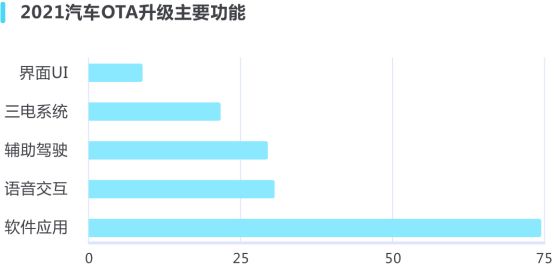 在具体OTA升级功能方面,涉及到软件应用的升级占了各大汽车品牌OTA的大头,语音交互和辅助驾驶功能也是过去一年OTA的升级重点,而车企对界面UI的优化和更新则显得较为谨慎。