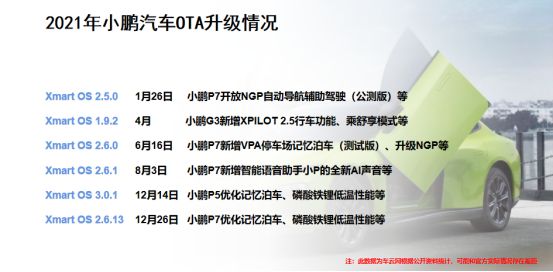 小鹏汽车在2021年一开年就打响了OTA升级的第一枪,通过新版本的更新为小鹏P7车型开放了NGP自动导航辅助驾驶功能。此后,又在不同版本的升级中上线了VPA停车场记忆泊车功能,实现了自动驾驶辅助系统和智能座舱的持续升级和快速迭代。值得一提的是,小鹏在年中还发布了“OTA编年史”,对OTA的重视程度由此可见。