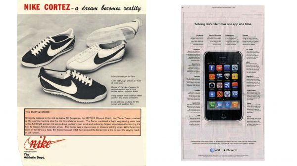 耐克鞋和iPhone的老广告。这些广告内容都强调的是产品功能,而不是鼓舞人心的信息。