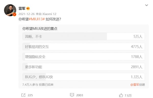 另一方面,为快速争夺华为空出的市场,小米2021年更快的产品发布节奏,间接压缩了MIUI的开发和适配时间,易导致各种卡顿问题的出现。在去年雷军发布的一项与MIUI有关的投票中,选择“流畅、不卡”和“BUG少”的用户达到6.3万,占比超过85%,毕竟流畅和稳定是用户对手机的最基本需求。