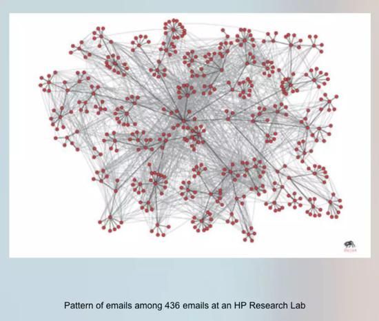 下图是惠普实验室对于电子邮件这种通讯方式的研究结果。他们发现,此时整个组织结构会表现出类似“蜂巢”的模式。