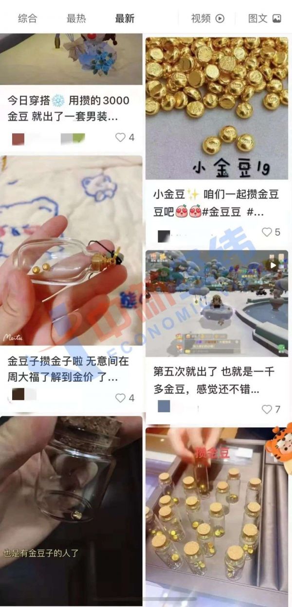80后的黄女士告诉中新经纬,自己去年开始攒金豆,起初她还质疑过金豆豆是商家的营销,“打开小红书上很多人在攒金豆豆,看到不少都说在某品牌买的。”