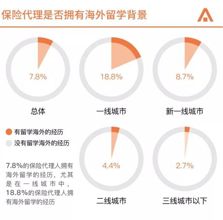 通过调查问卷也可以看出:7.8%的保险代理人拥有海外留学的经历,尤其在一线城市中这一比例达到了18.8%。以硕博高知、海归人士为代表的优秀人才的持续涌入,其更为开阔的国际视野以及专业素质,也为保险行业队伍走向高素质、高绩效、高品质等“三高”提供了保证。
