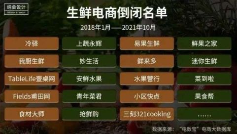 尽管后来得到了“个别岗位变动属正常组织资源调整”的回复,但生鲜电商市场糟糕的发展现状还是十分令人担忧,毕竟,根据“电数宝”电商大数据库的相关数据,在2018年1月至2021年10月期间,就有冷驿、上蔬永辉、易果生鲜、鲜果之家、我厨生鲜、妙生活、鲜来多、迷你生鲜、TableLife壹桌网、瓜粉网、水果营行、菜到啦、Fields甫田网、安鲜水果、青年菜君、小区快点、果食帮、食材大师、抢鲜购、三刻321cooking等多家生鲜电商倒下。