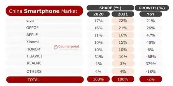 至于另一份数据,Counterpoint指出,OPPO在合并统计一加手机的情况下依然不敌vivo,后者以22%的市场份额领先OPPO,苹果像是坐了火箭一样来到第三,紧随其后是小米、荣耀、华为和realme。