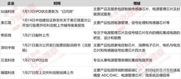 据笔者不完全统计,2022年1月1日至今,短短一个多月的时间里,已有6家模拟芯片厂商有了IPO新动态,都选择在科创版上市。其中,希荻微、臻镭科技已正式上市;芯龙科技成功过会;美芯晟则上市辅导备案报告;深圳中微首次公开发行股票招股说明书;灿瑞科技IPO状态更新为“已问询”。