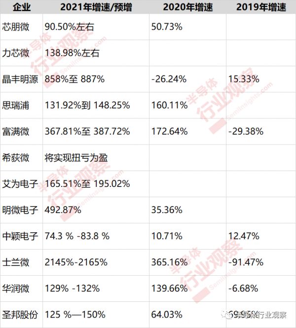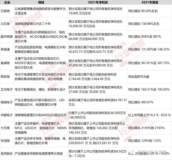 上市模拟芯片厂商2021年净利润额及增速