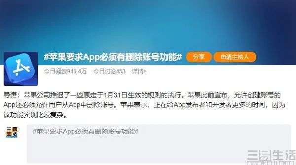 上周末,#苹果要求APP必须有删除账号功能#这个话题,登上了微博的热搜榜单。这是因为苹果方面此前曾宣布,自2022年1月31日开始,可以创建账号的APP还必须允许用户从APP中删除账号,但日前其推迟了这一规则的生效时间,因为苹果方面认为提供此该功能比较复杂,开发者需要更多的时间进行准备。