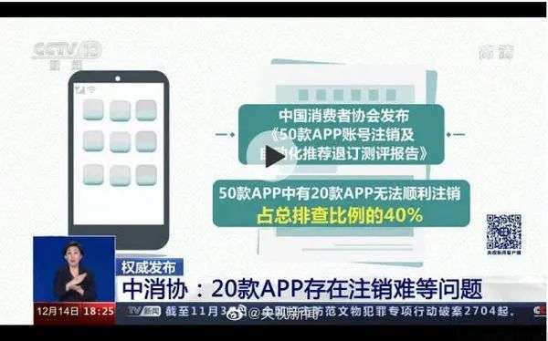 去年12月中旬,中国消费者协会发布的《50款App账号注销及自动化推荐退订测评报告》中显示,在是否可以顺利注销APP账号方面,50款APP中有20款存在不同程度的问题,占总排查比例的40%,其中嘀嗒出行、百合网、麦当劳、饿了么、腾讯视频、南方航空等知名APP则榜上有名。