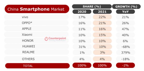其实,从Counterpoint Research的数据来看,今年的国产手机市场中,OPPO、小米、vivo和苹果都有着大幅度的市场份额提升,而且平均提升幅度都达到了5%。另一方面,华为的市场份额则从31%下降到了10%,下降幅度达21%,很显然华为失去的市场份额已经被四家厂商瓜分。
