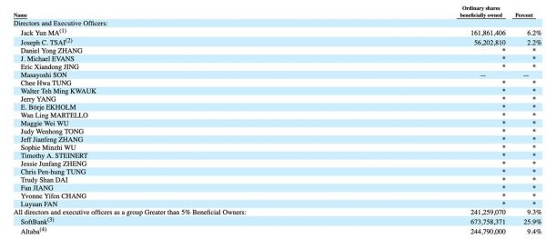 阿里巴巴截止2019年3月31日的2019财年年报显示,马云持股比例由去年的6.4%降至6.2%。仍是阿里巴巴的第一大个人股东。阿里巴巴董事局副主席蔡崇信的持股比例也由去年的2.3%下降至2.2%。软银仍是阿里巴巴最大股东,持有阿里的25.9%的股份;Altaba为阿里巴巴的第二大股东,持股比例为9.4%。