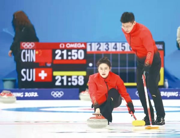 2022年2月2日晚,北京冬奥会冰壶比赛最先举行,在与瑞士组合的对阵中,中国冰壶混双选手凌智/范苏圆稳步进攻,在两名队员关键的最后一投中,凌智“一箭双雕”,范苏圆大力击打又拿到一分,中国队首站告捷。
