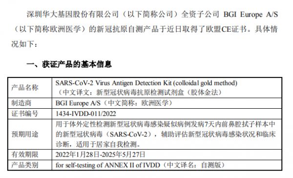 华大基因:全资子公司新冠抗原自测产品获得欧盟CE证书