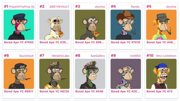 我们来举个例子。下图是 Rarity Tools 对 Bored Ape Yacht Club 前 10 的稀有度排序。