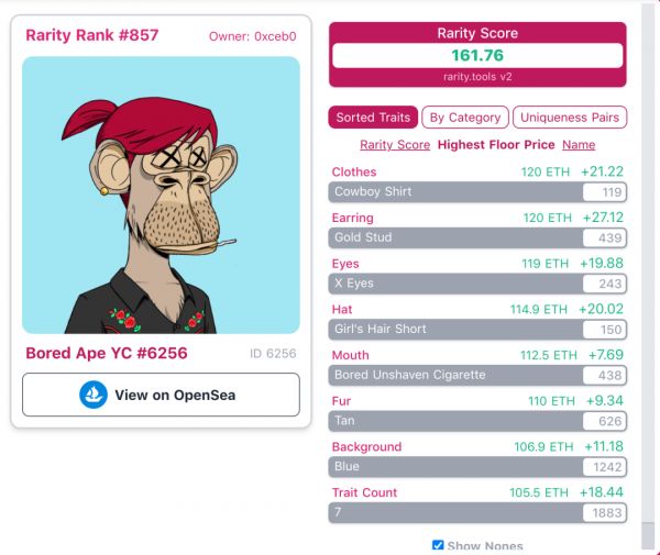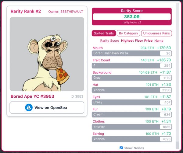 但对于大部分买高价 NFT 彰显身份的大户来说,买这只所谓排名第二的猴可能还不如买金皮肤、镭射眼,这些带有具备高识别度的显性元素的猴。