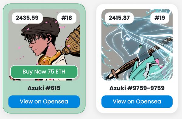 用我自己的话说是“把稀有度用在刀刃上”。例如下图中两个在排名网站上分别位列 18、19 名的 Azuki,真实的市场价值一定是后者高很多。因为后者的 Type(种族)是 Spirit(灵魂),这种十米开外就能看出来稀有的元素,肯定比前者更受欢迎。