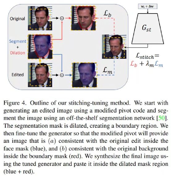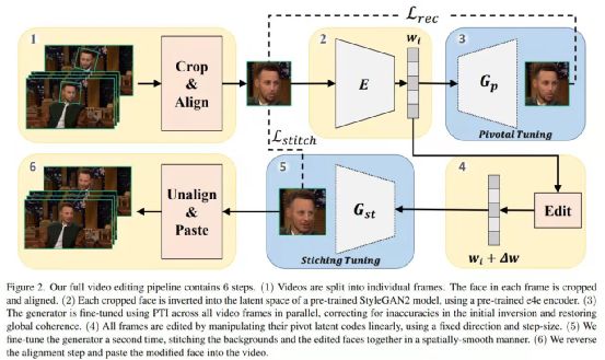 为了解决这个问题,他们将进一步训练初始生成器(3),并使用它来帮助使所有帧中的生成器更加相似和全局一致。他们还引入了另外两个步骤,一个编辑步骤和一个他们称之为"拼接-调谐"的新操作。