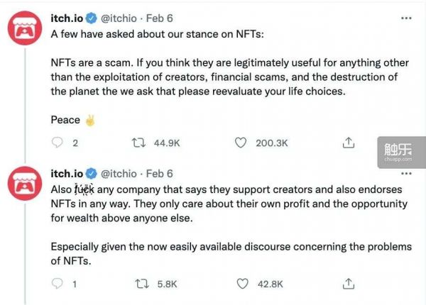 2月6日,独立游戏平台itch.io在推特上公开反对NFT。