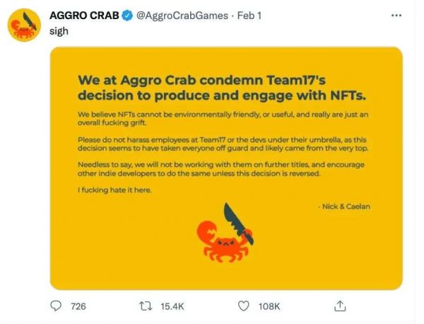 独立游戏开发商Aggro Crab曾因为发行商Team17试图开展NFT业务要与之中断合作,直到Team17官宣暂停了相关项目。Aggro Crab同样转发了itch.io那条被热烈讨论的推文