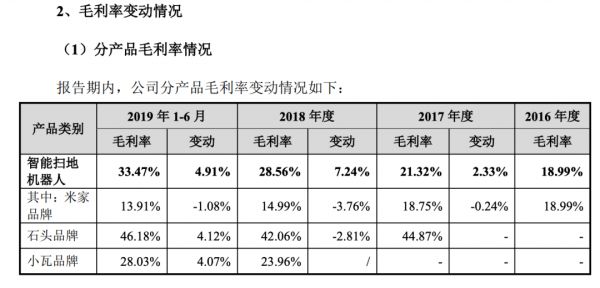 根据石头科技招股说明书,2019年上半年,米家扫地机器人、小瓦扫地机器人、石头扫地机器人毛利率分别为13.91%,28.03%,46.18%。