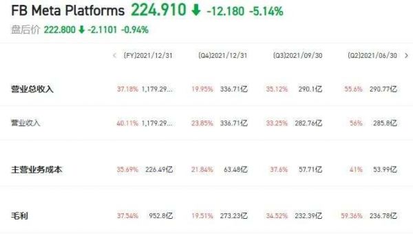 据财报显示,Meta公司第四季度营收336.7亿美元,与市场预期334.3亿美元基本持平,每股收益3.67美元,小幅低于预期的3.84美元。日活用户DAU 19.3亿,略低于预期的19.5亿。月活用户MAU 29.1亿,也略低于预期的29.5亿。今年一季度指引营收270-290亿美元,低于预期的302.5亿美元。