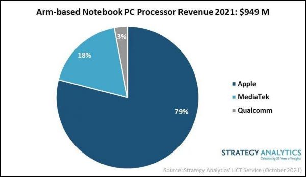 另根据Strategy Analytics早前所发布的报告显示,预计2021年,Arm笔记本电脑处理器的收益将增长超过三倍。苹果、联发科和高通将在2021年占据Arm笔记本电脑处理器市场的最大收益份额。从出货量来看,基于Arm的笔记本电脑处理器出货量将在2021年增长两倍以上,占笔记本电脑处理器总出货量的10%以上。其中,苹果在 M1的推动下,将在2021年占据近80%的收益份额。