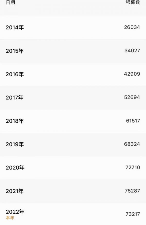 但近十年的时间里,银幕数量的成长速度远远超过了电影内容的供给和票房的增速。灯塔专业版显示,2022年目前的银幕数是73217块,是2013年的近5倍。影城和银幕数量在涨,但票房的增速却逐年放缓。
