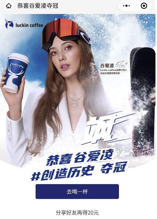 冬奥会开幕前,谷爱凌就频繁出现在飞机场、地铁站、电梯间、微博开屏广告上。瑞幸咖啡店的海报、京东的弹窗、蒙牛的包装……谷爱凌的面孔随处可见。