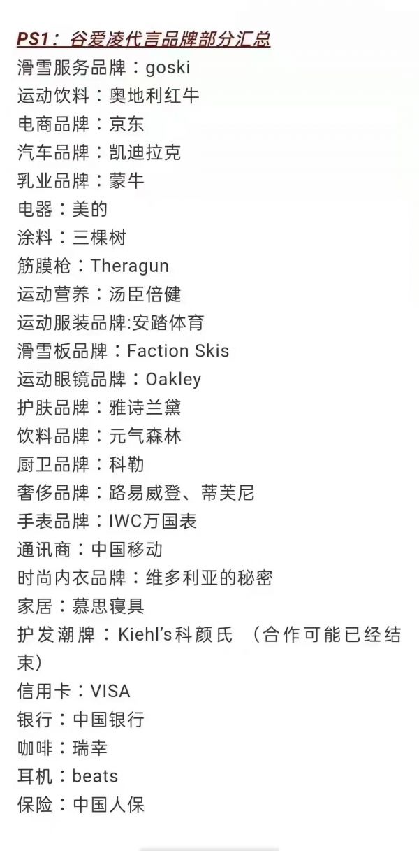 2021年之前,谷爱凌就斩获了7家代言,分别是Faction Skis、奥地利红牛、安踏体育、蒙牛、Oakley、Beats by Dre、GOSKI。2021年代言14家,分别是三棵树、蒂芙尼、维密、路易威登、IWC万国表、中国银行、中国移动、凯迪拉克、瑞幸咖啡、科勒、雅诗兰黛、元气森林、汤臣倍健Yep等。