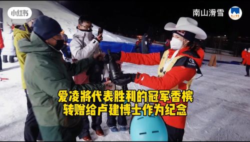 今年1月1日,谷爱凌在自由式滑雪世界杯卡尔加里站U型场地夺冠,将标志着冠军胜利的香槟酒赠予去现场加油的卢建。图片截自南山滑雪视频。