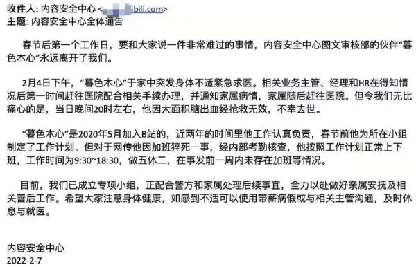 邮件中所提审核部的伙伴‘暮色木心’,出生于1997年,生前就职于B站武汉分部,这个春节他继续上班,没有回家。2月4日,他因“大面积脑出血”经抢救无效去世。
