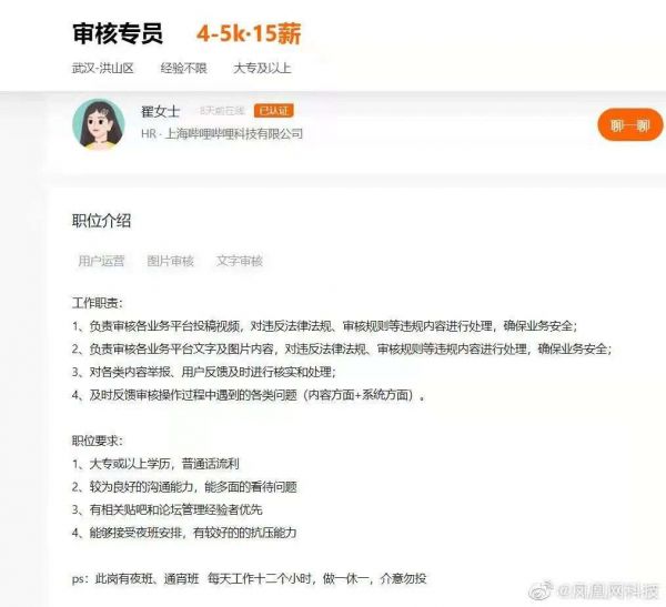 这封邮件的截图很快散播开来,而人们很快就在多个招聘网站上,找到了B站发布的“审核专员”岗位招聘信息,其中明确写道:此岗有夜班,通宵班,每天工作十二个小时,做一休一,介意勿投。