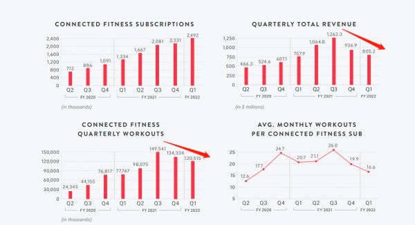 根据去年11月份发布的2022财年一季度财报,Peloton总营收为8.05亿美元,虽录得6%的同比增长,但表现不及市场预期的8.09亿美元。此外,其一季度销售额同比增幅为6%,远低于上一财年同期的230%,32%的毛利率也不及市场预期的34%。