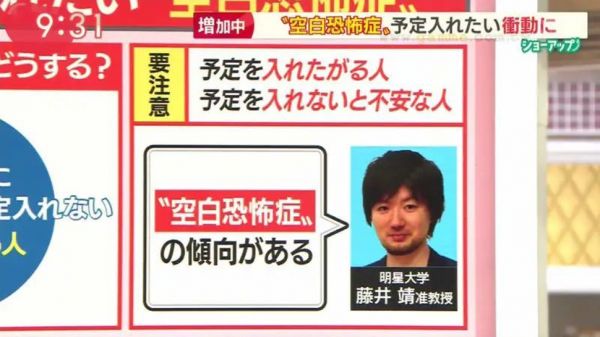 根据日本朝日电视台的晨间情报节目「羽鸟慎一モーニングショー」(中文译作:《羽鸟慎一晨间秀》),很多人看似过着积极自律的生活,实际上是“空白恐怖症”患者。