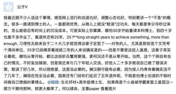 知乎拥有数十万粉丝的“公子V”发布过一条上过热搜的想法:好多人二十多岁就说自己做了错误决策,耽误了好几年,所以很绝望。