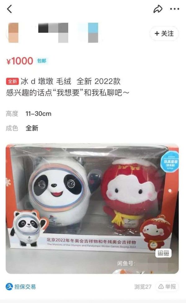 在某二手交易平台上,官方价格298元的吉祥物毛绒玩具,标价1000元。