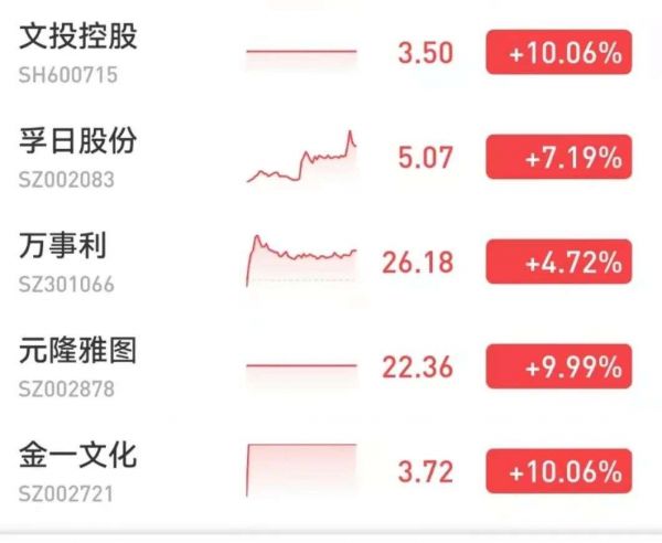 其中,涉及到的部分上市企业包括金一文化、元隆雅图、万事利、孚日股份、文投控股、王府井、中体产业、华瓷股份、菜百股份等。截至2月8日A股收盘,相关概念股集体上涨,而金一文化、元隆雅图和文投控股三家上市公司涨停。