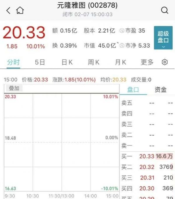 2月7日,虎年迎来第一个交易日。元隆雅图开盘即一字涨停,股价涨至20.33元。在买一位置,一度有超过37万手买单封死涨停,封单资金超过7.5亿。原本在A股市场默默无闻的元隆雅图,几乎一跃成为当天最热门的股票。