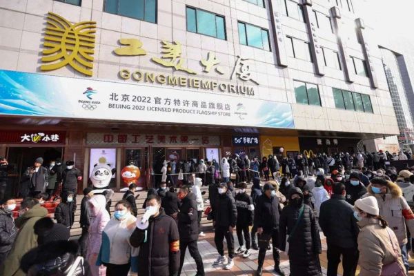 赛场之外,这几天北京王府井步行街最南端的工美大厦门前,时不时就排起了长队。
