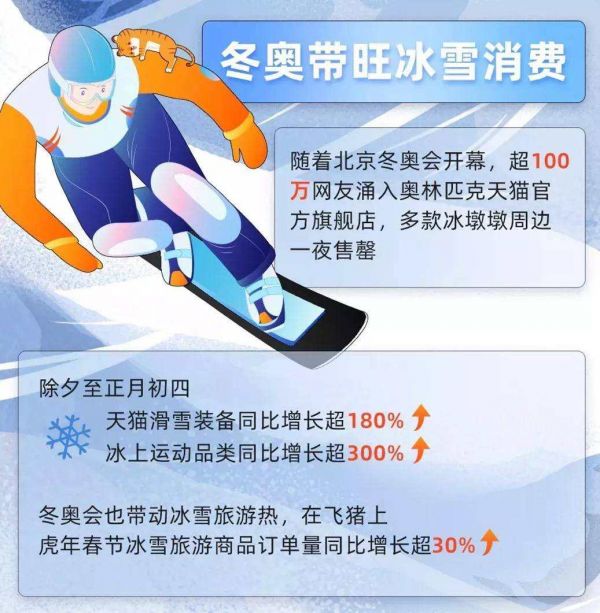 2月4日,冬奥会开幕式还没结束,各品牌羽绒服、国旗款外套、谷爱凌同款卫衣等就纷纷登上淘宝热搜。阿里巴巴发布的《虎年春节消费趋势报告》显示,当天有超过100万网友涌入奥林匹克天猫官方旗舰店。这股抢购热潮在随后的几天里,只增不减,滑雪装备、冰上运动品类的销量大幅增长。这背后,是国人正在花式“解锁”各类冰雪经济。