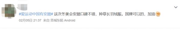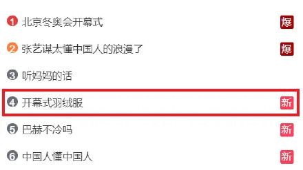 在2月4日开幕当晚,“夹克开幕式”、“夹克跑道”、“加拿大队制服”、“芬兰夹克”等话题登上了微博热搜榜,2月6日,“开幕式羽绒服”话题获得4.5亿浏览量。