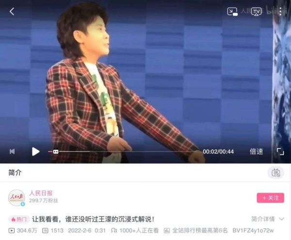 一夜之间,王濛金句频出的解说让她的视频在各大平台疯狂转发,B站上甚至有了王濛专门的鬼畜,她的解说被人民日报转发播放数百万。