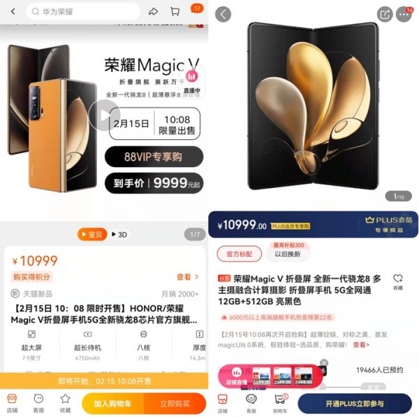 值得一提的是,为限时限量,淘宝、京东商城中,想预约荣耀Magic V还要先开通88vip和京东plus会员,且两平台最近一次预约抢购时间已经排到了2月15日。